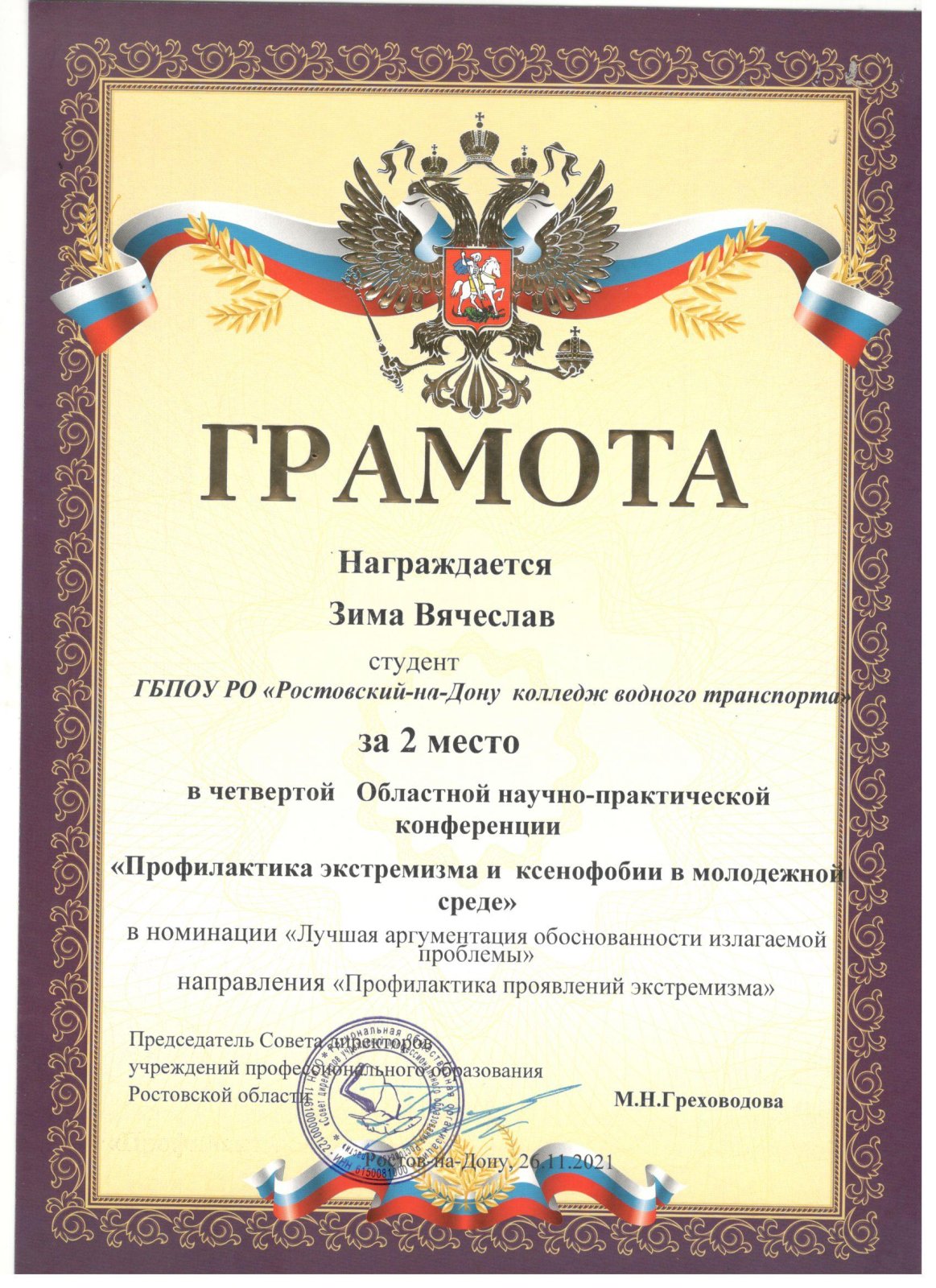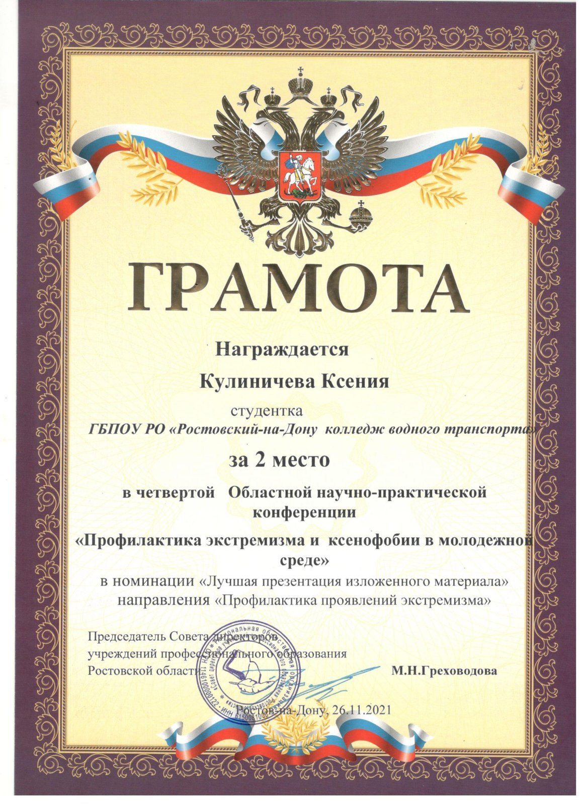 26 ноября 2021 года курсанты ГБПОУ РО «Ростовский-на-Дону колледж водного транспорта» приняли участие в областной заочной научно-практической конференции «Профилактика экстремизма и ксенофобии в молодежной среде». Наши курсанты подготовили статьи и презентации по направлениям конференции. По итогам мероприятия, наши курсанты Кулиничева Ксения и Зима Вячеслав поделили 2-е призовое место.