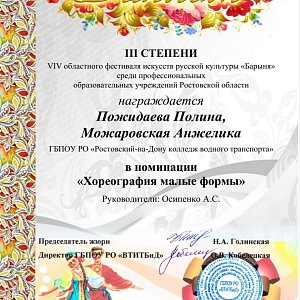 С 22 апреля по 12 мая 2022года в Ростовской области проводился VIV областной фестиваль искусств русской культуры "Барыня" среди профессиональных образовательных учреждений Ростовской области в городе Волгодонске (online). Курсанты ГБПОУ РО "Ростовский-на-Дону колледж водного транспорта" групп Т-11 и Т-12 Пожидаева Полина и Анжелика Можаровская приняли участие в номинации "Хореография малые формы". Достойно исполнив Народный танец, они завоевали почетное 3 место среди десятка других учебных заведений.