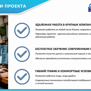 Все происходит онлайн: можно работать удаленно из дома, в удобное время и в любом городе России.