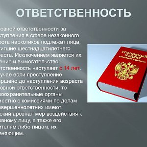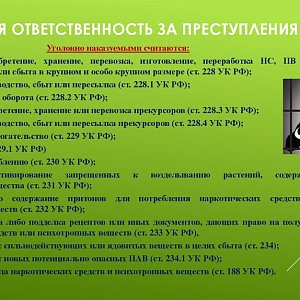 Уголовная ответственность за незаконный оборот наркотических средств и психотропных веществ установлена в 9 статьях УК РФ (ст.ст. 228, 228.1, 228.2, 229, 230, 231, 232, 233,188).