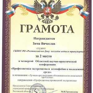26 ноября 2021 года курсанты ГБПОУ РО «Ростовский-на-Дону колледж водного транспорта» приняли участие в областной заочной научно-практической конференции «Профилактика экстремизма и ксенофобии в молодежной среде». Наши курсанты подготовили статьи и презентации по направлениям конференции. По итогам мероприятия, наши курсанты Кулиничева Ксения и Зима Вячеслав поделили 2-е призовое место.