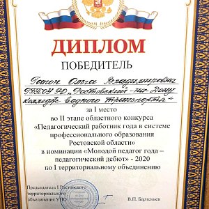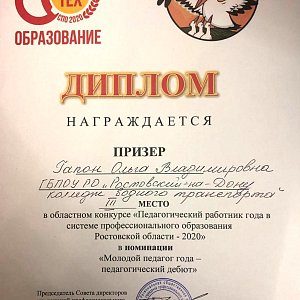 23 октября 2020 года преподаватель английского языка ГБПОУ РО «Ростовский-на-Дону колледж водного транспорта» Ольга Владимировна Гапон заняла I место во II этапе областного конкурса «Педагогический работник года в системе СПО Ростовской области» в номинации «Молодой педагог года - педагогический дебют- 2020» по I территориальному объединению.