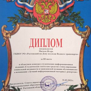31 марта 2021г курсанты ГБПОУ РО «Ростовский-на-Дону колледж водного транспорта» приняли участие в областном конкурсе студенческих информационных изданий «Студенческая газета как средство стимулирования социальной активности и гражданской позиции обучающихся» в номинации «Лучший информационный материал: репортаж».