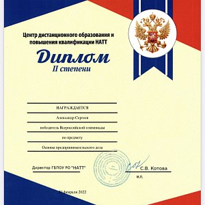 3. Сергеев А.М. – Диплом II степени Всероссийской олимпиады по предмету Основы предпринимательского дела.