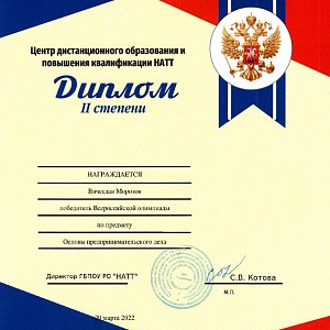 3. Морозов В.В. – Диплом II степени Всероссийской олимпиады по предмету Основы предпринимательского дела.
