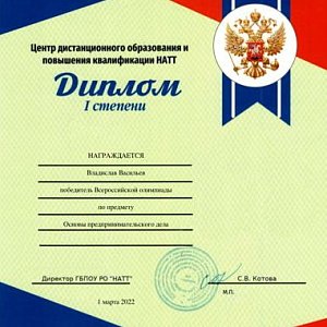 1. Васильев В.Е. – Диплом I степени Всероссийской олимпиады по предмету Основы предпринимательского дела.