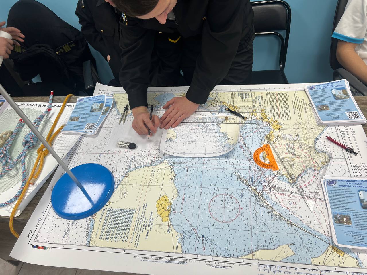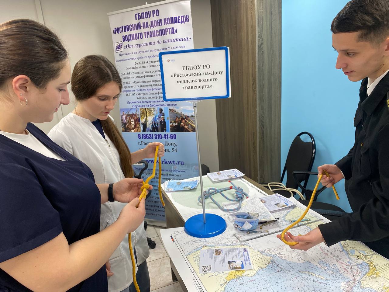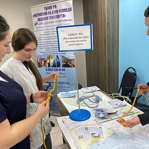 Курсанты нашего колледжа рассказали абитуриентам о специальностях морского дела, показали действующие на флоте виды узлов и учили гостей ярмарки их правильно вязать.