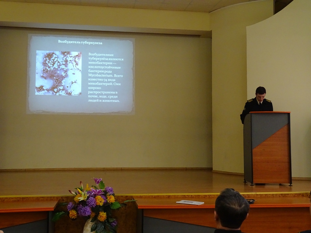 24 марта 2016 г. в актовом зале ГБПОУ РО «Ростовский-на-Дону колледж водного транспорта» была проведена беседа по первичной профилактике туберкулеза среди курсантов колледжа.