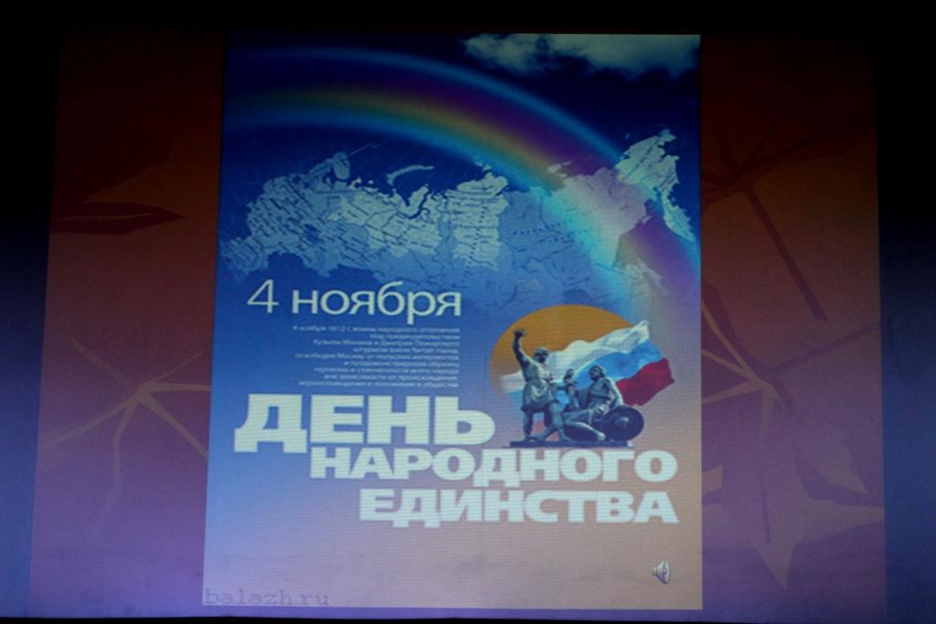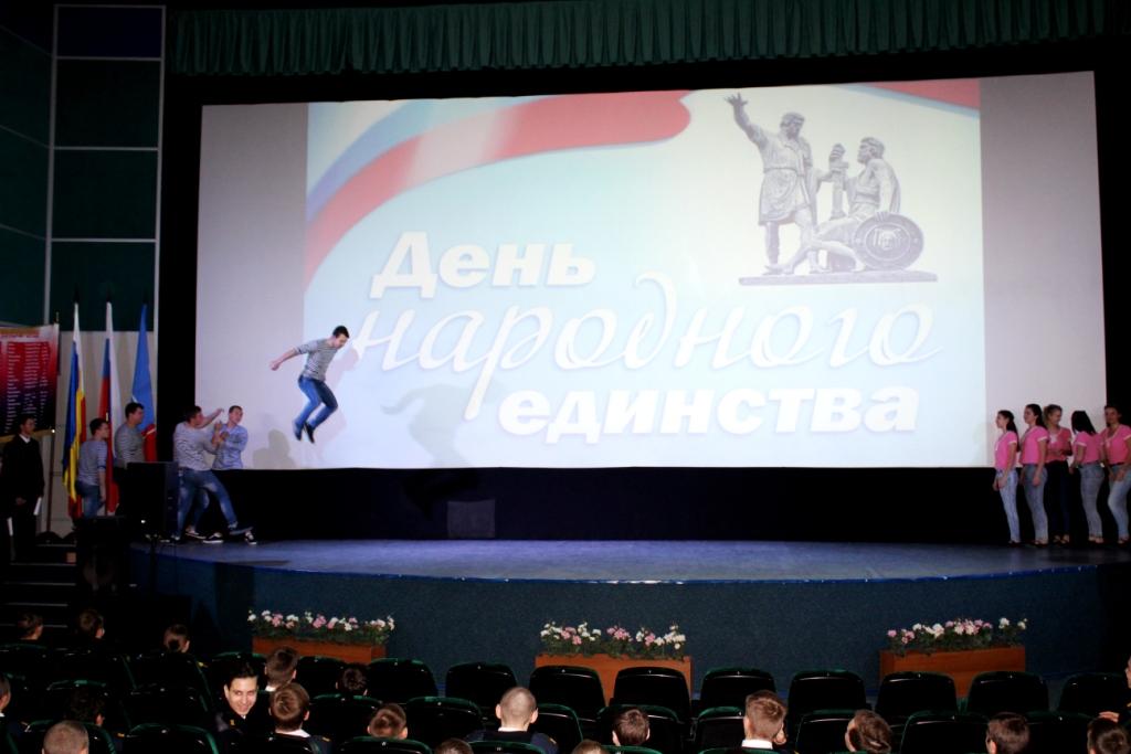 1 ноября 2017г. в зрительном зале Патриотического центра «Победа», курсанты ГБПОУ РО «Ростовский-на-Дону колледж водного транспорта» приняли участие в праздничном мероприятии посвященном «Дню Народного Единства». Этот день занимает особое место среди государственных и православных праздников современной России. Он связан с событиями 1612 года – подвигом наших предков, которые сплотились во имя свободы и независимости Родины. Это праздник взаимопомощи и единения. Россия большое многонациональное государство, где в мире и согласии проживают разные народы. И люди могут быть счастливы только тогда, когда на их земле царит мир и дружба. Всех нас объединяет чувство гордости за свою страну, за свою область, за свой город, за их славную историю. И в этот праздничный день с особенной силой ощущаем, единство и дружбу между народами, ощущаем что мы – единый и могучий русский народ, и у нас одно Отечество – Россия.