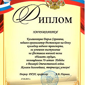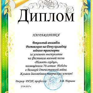 В преддверии празднования 70-летия Великой Победы 27 апреля 2015 года на базе Ростовского института защиты предпринимателя, состоялся областной фестиваль военно-патриотической песни «Память сердца», в котором принял участие вокальный ансамбль Государственного бюджетного профессионального учреждения Ростовской области «Ростовский-на-Дону колледж водного транспорта», а так же творческие коллективы других учебных заведений среднего и высшего профессионального образования Ростовской области. В программе мероприятия прозвучали песни военных лет.