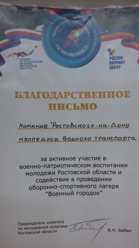 Сборную команду от г. Ростова-на-Дону представляла флотская молодежь Ростовской Региональной Военно-Патриотической организации «Молодежный Морской Клуб», в которую вошли курсанты ГБПОУ РО «Ростовского-на-Дону колледжа водного транспорта» и курсанты Клуба юных моряков городского Дворца творчества детей и молодежи и. Ее строевую подтянутость, общефизическую, прикладную физическую, стрелковую, огневую, тактическую подготовку строгие судьи из элитного подразделения Вооруженных Сил РФ оценили на высоком уровне. Призовое место Ростовской флотской молодежи явилась результатом системной военно-патриотической работы и усиленной подготовки в структурах вышеуказанных организаций опытными педагогами А.Н. Лазаревым и И.В.Карасевым.