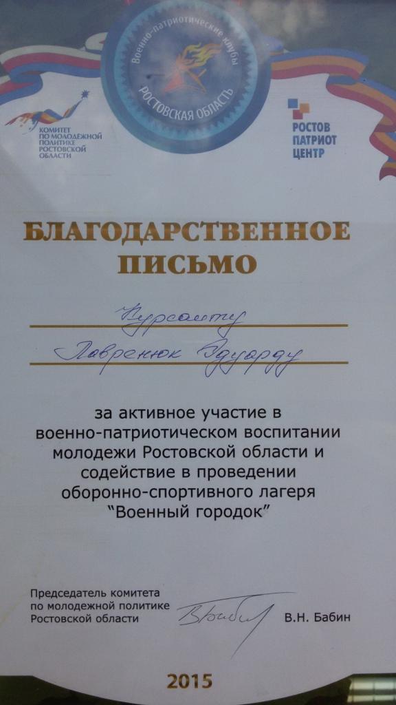 В соответствии с Распоряжением Правительства Российской Федерации от 03.02.2010 №-134 «О Концепции федеральной системы подготовки граждан Российской Федерации к военной службе на период до 2020 года»; во исполнение Государственной программы Ростовской области «Молодежь Ростовской области», утвержденной Правительством Ростовской области от 25.09.2013 №-588; Комитетом по молодежной политике Ростовской области и государственным автономным учреждением Ростовской области «Центр патриотического воспитания молодежи Ростовской области» в период с 29 мая по 5 июня 2015 г. был проведен оборонно-спортивный лагерь «Военный городок».