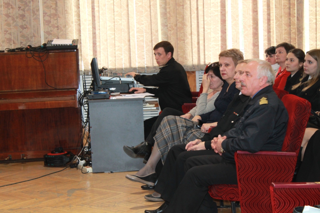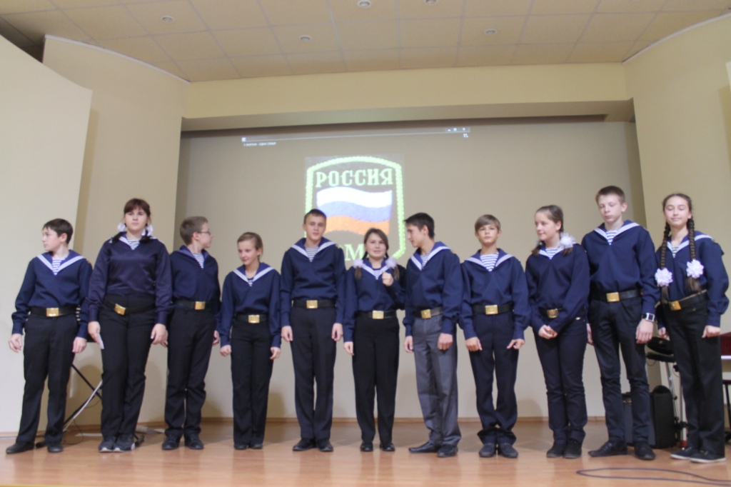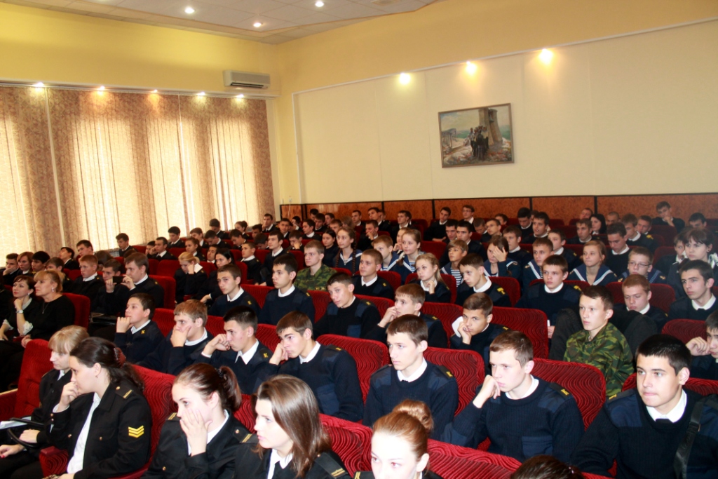 Мероприятие завершилось дружным исполнением флотской песни «Экипаж одна семья» полным залом первокурсников колледжа с последующим троекратным « Ура!!!» Российскому Флоту.|