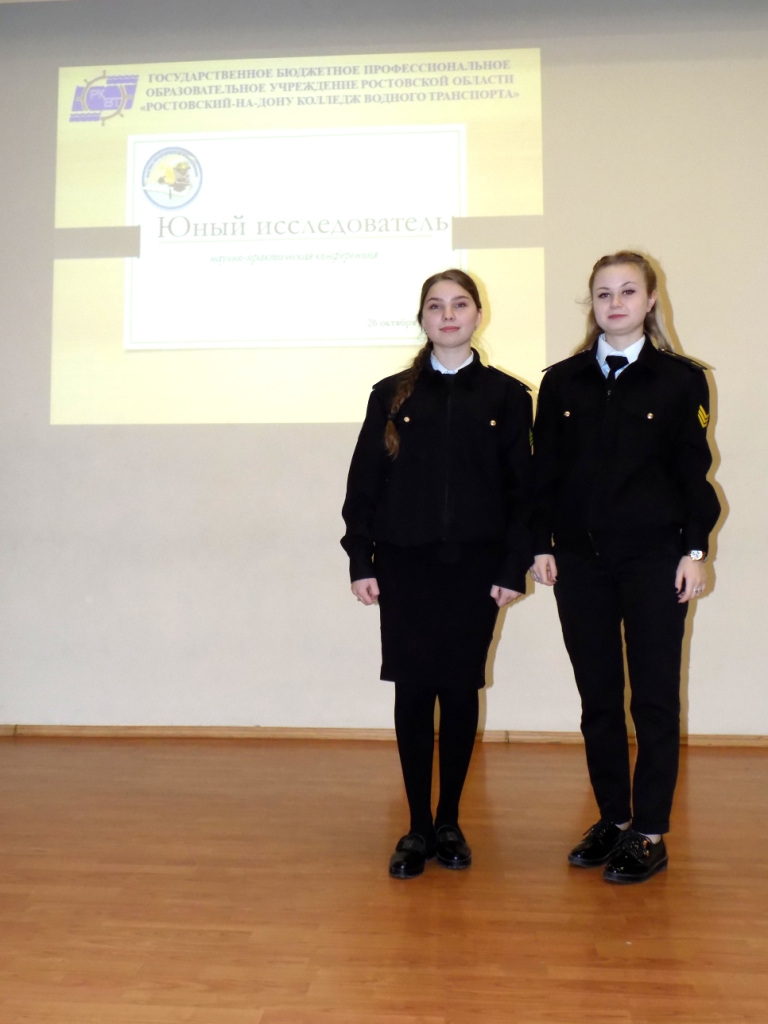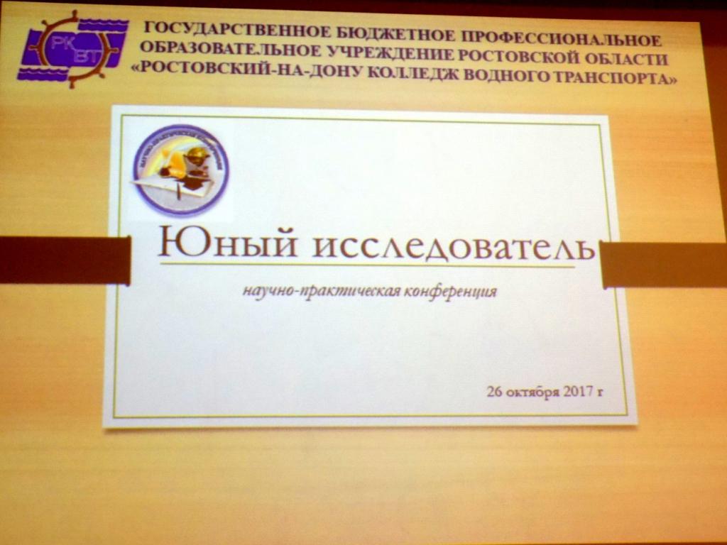 26 октября 2017 года на базе Ростовского-на-Дону колледжа водного транспорта была проведена ежегодная научно-практическая конференция «Юный исследователь». В конференции приняли участие студенты первого курса. Их вниманию были представлены проекты, признанные лучшими, в рамках выбранной учебной дисциплины, по итогам 2016-2017 учебного года. Работа конференции велась по двум направлениям: