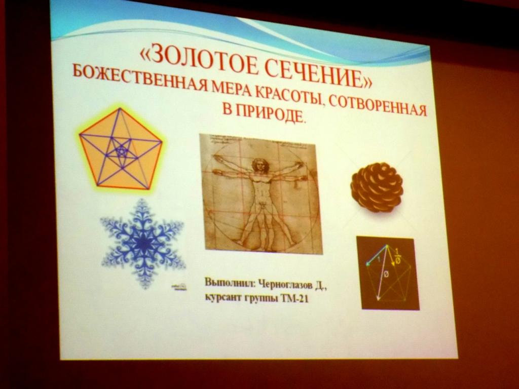 1.      «Золотое сечение» курсанта группы ТМ-21 Черноглазова Д.В., научный руководитель - Абрамова И.А.;