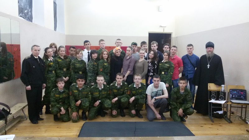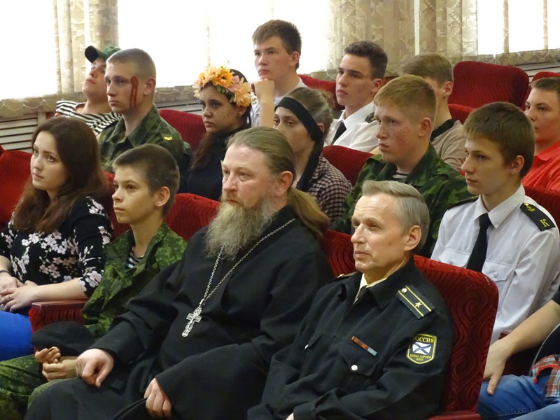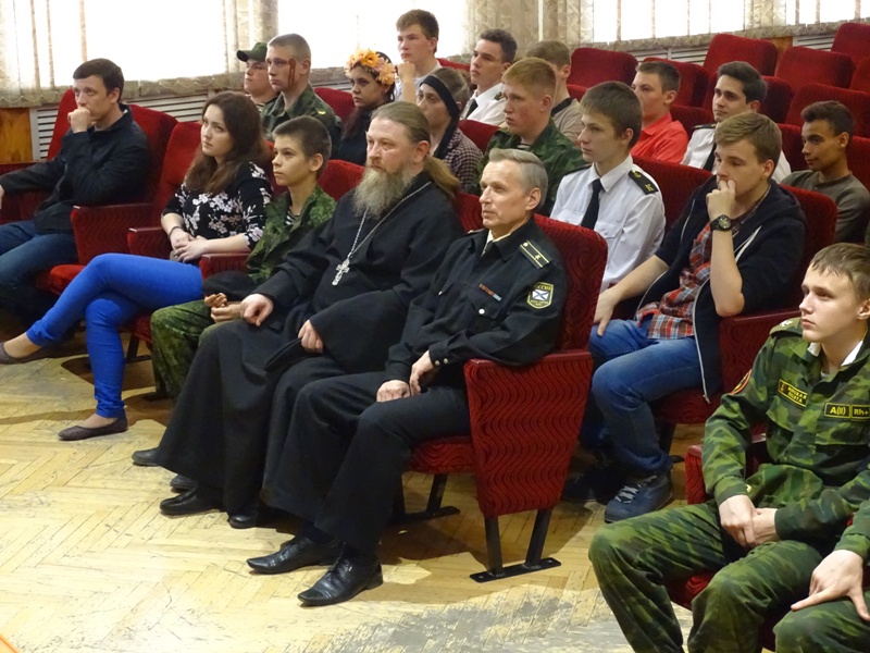 И в завершении урока мужества - проникновенное выступление духовника Молодежного Морского Клуба Отца Вадима. Он сказал замечательные слова: «В том, что святой подвиг христианского мученичества совершен именно такими ребятами, видится промысел и особая милость Божия к нашей нынешней молодежи. Ее пытаются развратить, запутать сознание всеми средствами; но все равно в страшный час испытаний крещеные души воспламеняются искрами благодати, пребывающей в них, и эта благодать позволяет им сделать достойный выбор.