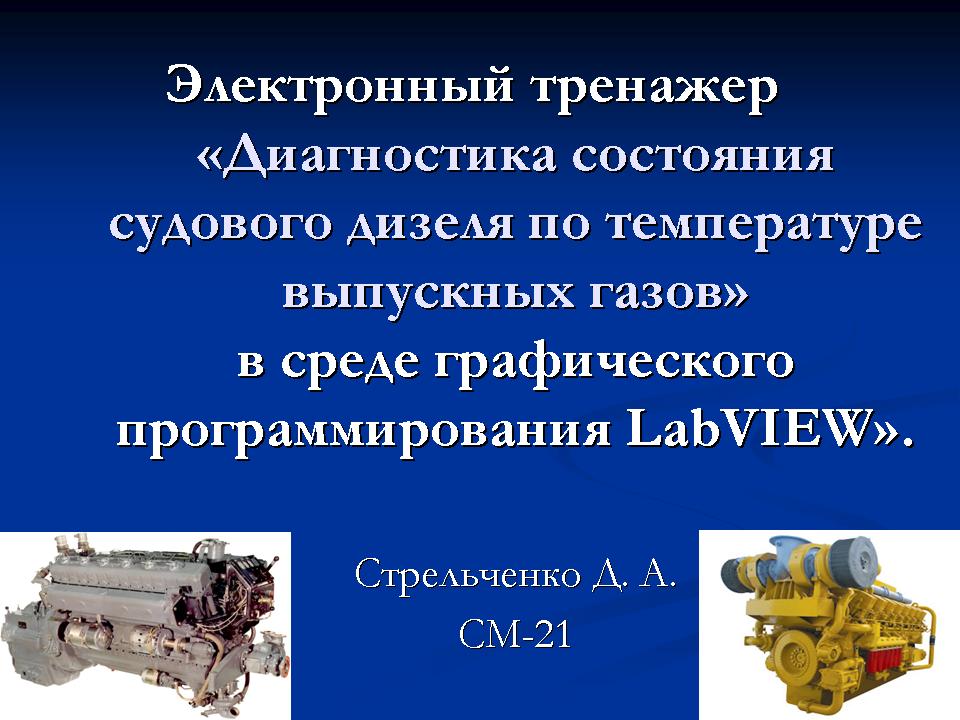 - Электронный тренажер «Диагностика состояния судового двигателя по температуре выпускных газов в среде графического программирования LabVIEW (студент Стрельченко Дмитрий) и др.