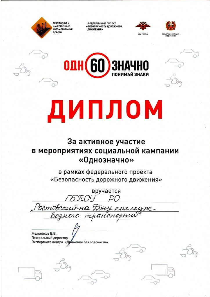 БЕЗОПАСНОСТЬ ДОРОЖНОГО ДВИЖЕНИЯ 20 сентября 2019г. Госавтоинспекцией МВД России в рамках реализации федерального проекта «Безопасность дорожного движения» была проведена лекция с обучающимися ГБПОУ РО «Ростовский-на-Дону колледж водного транспорта» направленная на формирование культуры поведения участников дорожного движения. Участники лекции были награждены ценными подарками и призами.