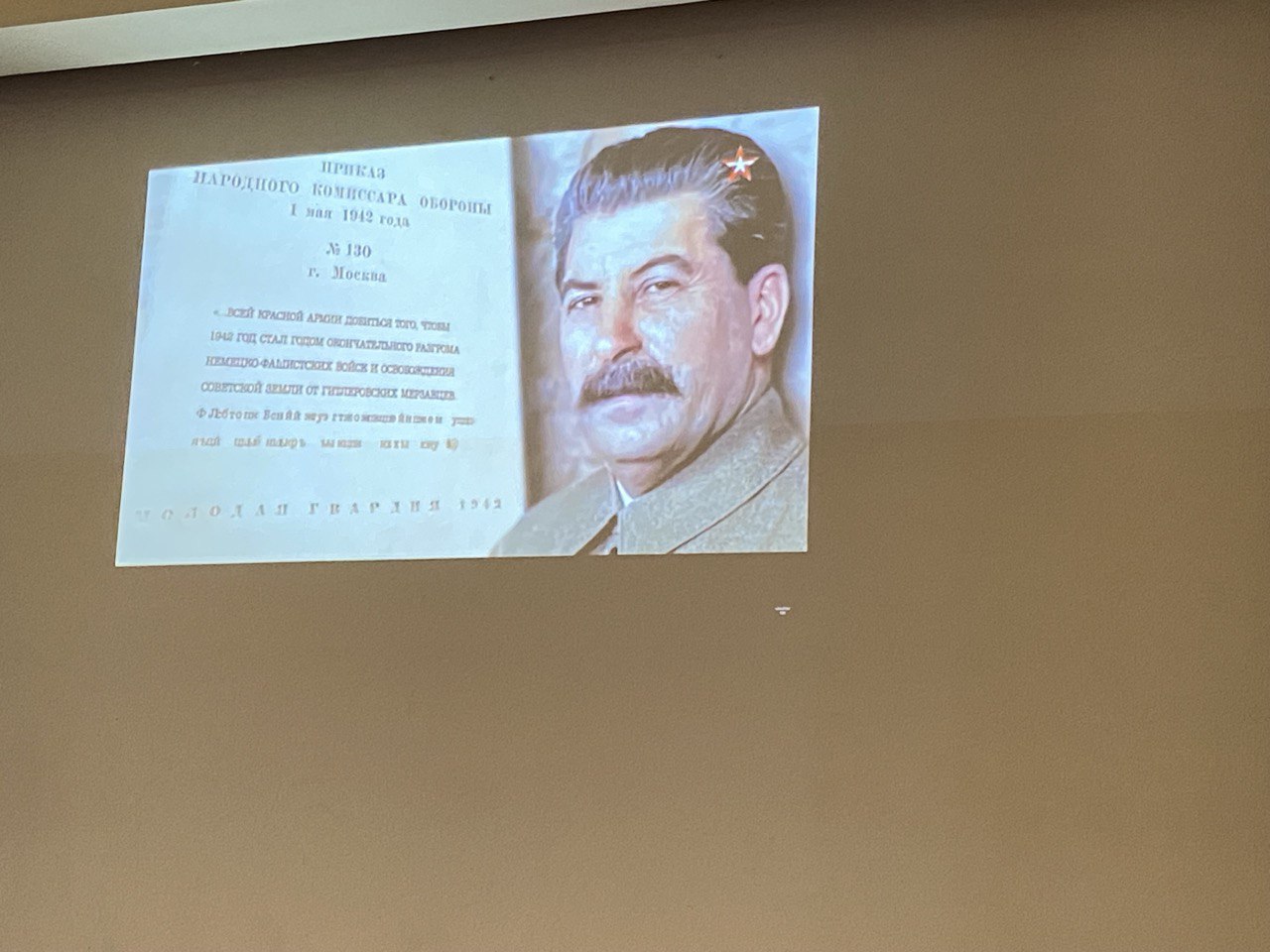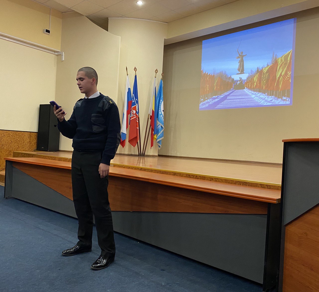 Советник директора по воспитанию Щетинина Д.В. совместно с преподавателем истории Маценко Е.В. провели лекцию по теме «Сталинградская битва» и кинолекторий «Битва за Россию. Сталинград». Курсанты прочли стихотворения, посвященные кровопролитной войне, в которой погибло более миллиона человек. Завершилось мероприятие минутой молчания.