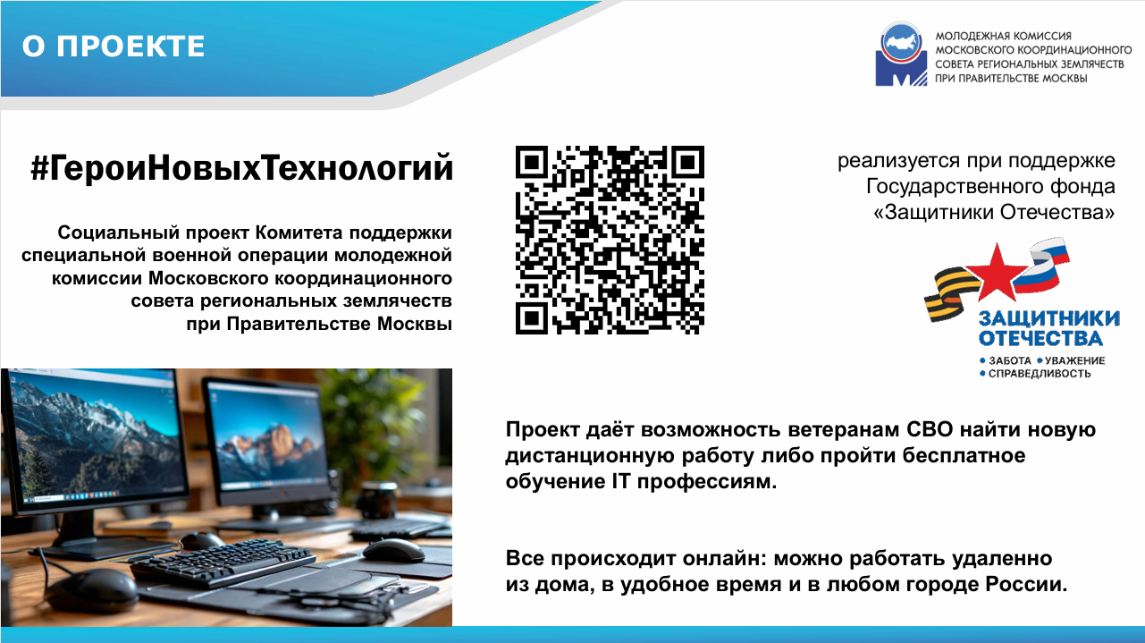 Дистанционное трудоустройство и бесплатное обучение IT профессиям ветеранов СВО, имеющих ограниченные возможности здоровья. Проект даёт возможность ветеранам СВО найти новую дистанционную работу либо пройти бесплатное обучение IT профессиям.