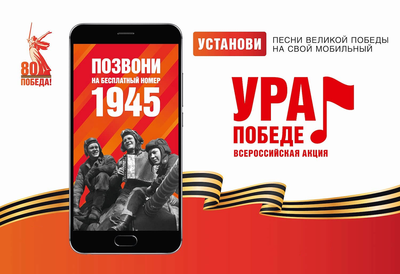 В год 80-летия Победы в Великой Отечественной войне проводится акция «Ура Победе!». Она адресована всем, кому дорога память о наших героях, кто хочет отдать дань уважения ветеранам, поддержать всенародный праздник. Для этого в рамках акции предлагается использовать возможности вашего мобильного телефона. Масштабный мультимедийный проект продлится до 15 мая 2025 года.