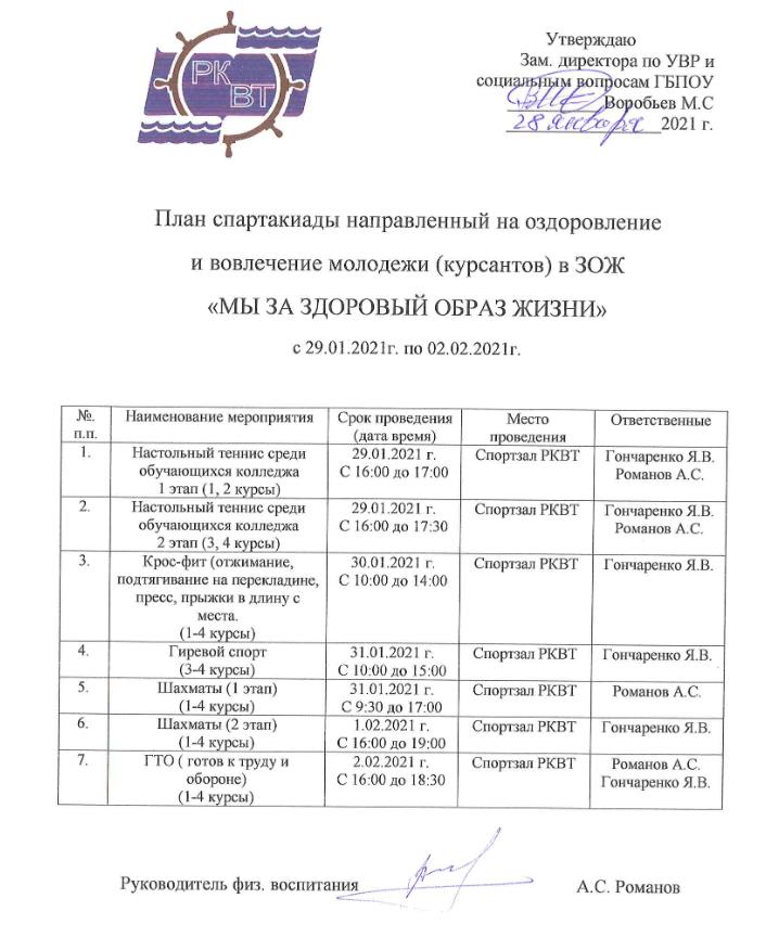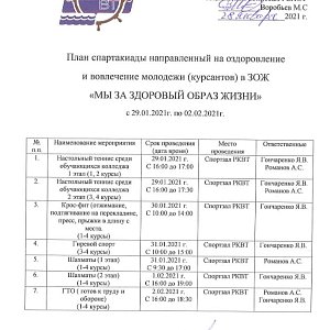 План спартакиады с 29.01.2021г. по 02.02.2021г. направленный на оздоровление и вовлечение молодежи (курсантов) в ЗОЖ.