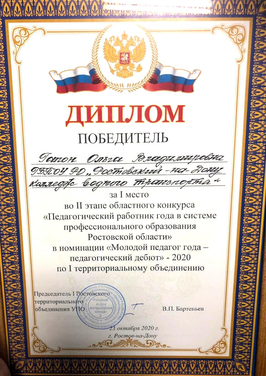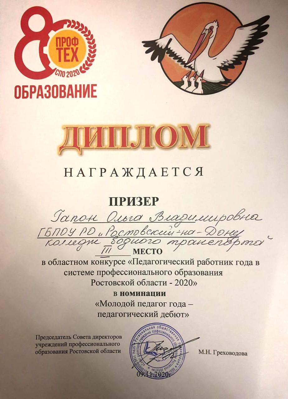 23 октября 2020 года преподаватель английского языка ГБПОУ РО «Ростовский-на-Дону колледж водного транспорта» Ольга Владимировна Гапон заняла I место во II этапе областного конкурса «Педагогический работник года в системе СПО Ростовской области» в номинации «Молодой педагог года - педагогический дебют- 2020» по I территориальному объединению.