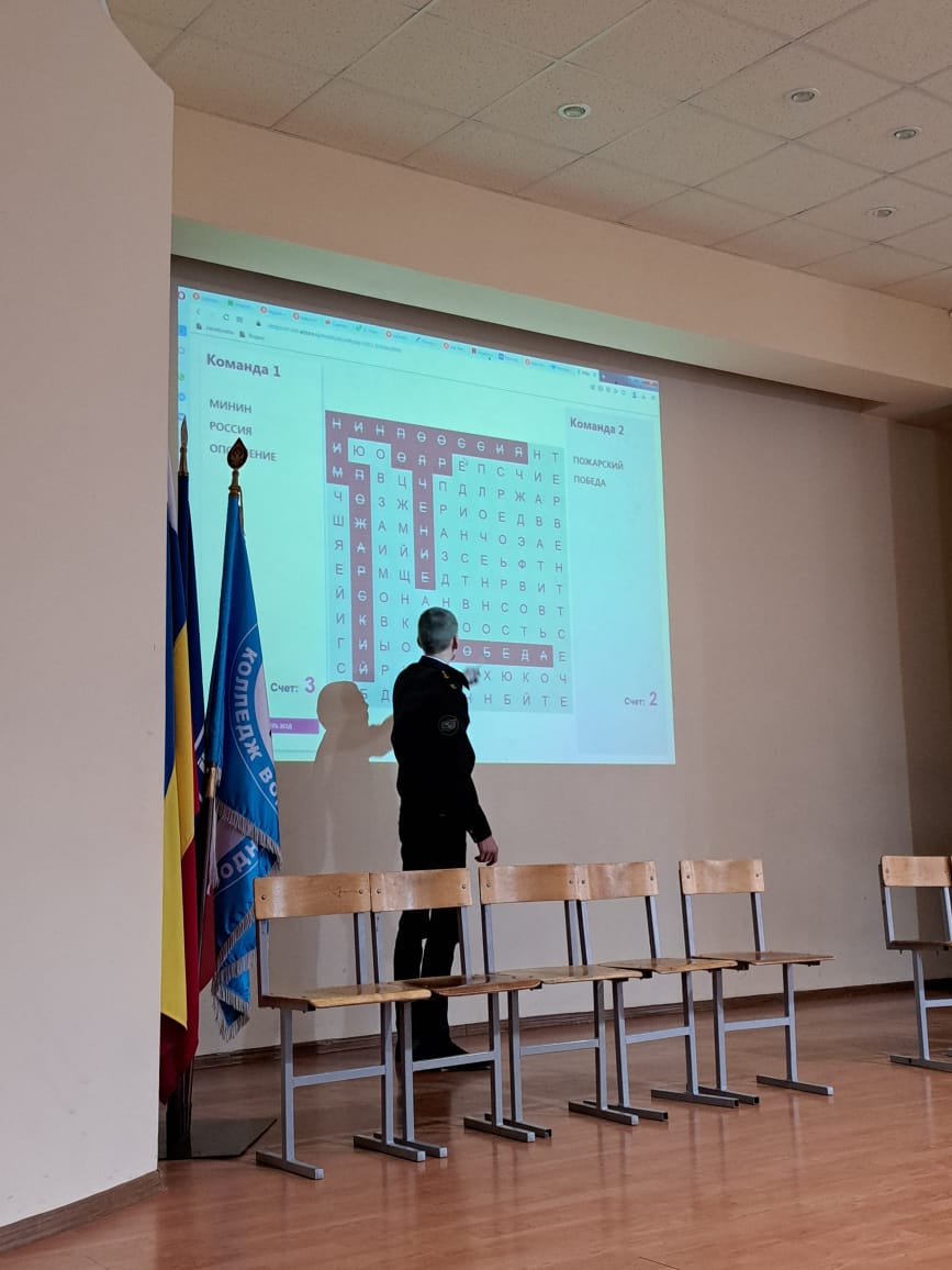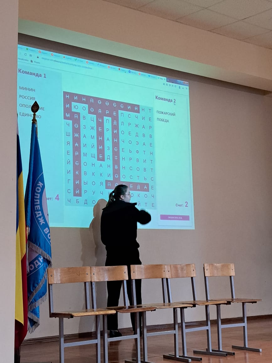 1 ноября 2022 г. в рамках гражданско-патриотических мероприятий Епишева А.А и Казанцева Ж.А провели интерактивную интеллектуальную игру, приуроченную ко Дню народного единства «Пока мы едины» , участниками которой стали курсанты групп Т-31, Т-21, ТМ-12, ТС-13. Ребята отвечали на вопросы, касающиеся прав, свобод и обязанностей гражданина и патриота, а также продемонстрировали свои знания в области истории и обществознания. Вопросы не всегда были легкими, приходилось задумываться, размышлять, и это радует. Как писал классик: «Поэтом можешь ты не быть, но гражданином быть обязан». И ребята подтвердили это еще раз, соглашаясь с поэтом.