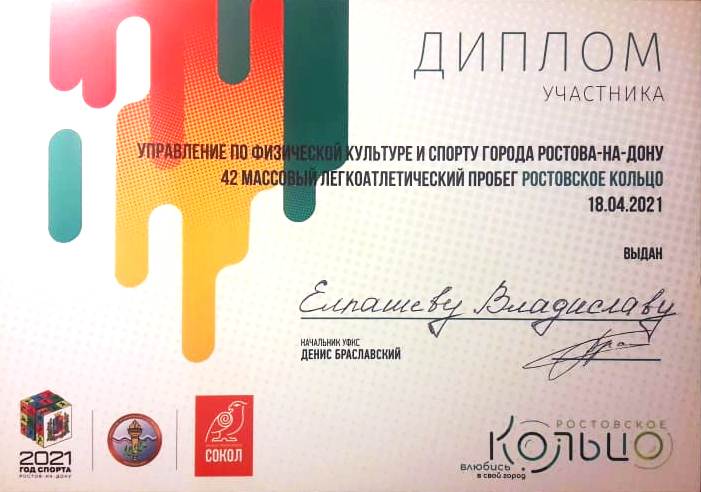 РОСТОВСКОЕ КОЛЬЦО 18 апреля 2021 года курсанты ГБПОУ РО «Ростовский-на-Дону колледж водного транспорта» приняли участие в пробеге "Ростовское кольцо". Забег не соревновательный у него нет электронного хронометража и личных рекордов на время, так же, как и медалей за первое место. Но, как и всегда, участникам забега вручили памятные Дипломы участника. Мы бежим вместе, чтобы по-другому увидеть наш замечательный город, почувствовать запах весны, силу Дона и снова влюбиться в родной и знакомый Ростов-на-Дону. Ростовское Кольцо — традиционный легкоатлетический пробег по улицам города. Маршрут поделён на несколько участков с остановками для отдыха. Каждый участник может выбрать свою дистанцию в зависимости от уровня подготовки и желания. Маршрут кольцевой и проходил по разным районам города и каждый год новый!