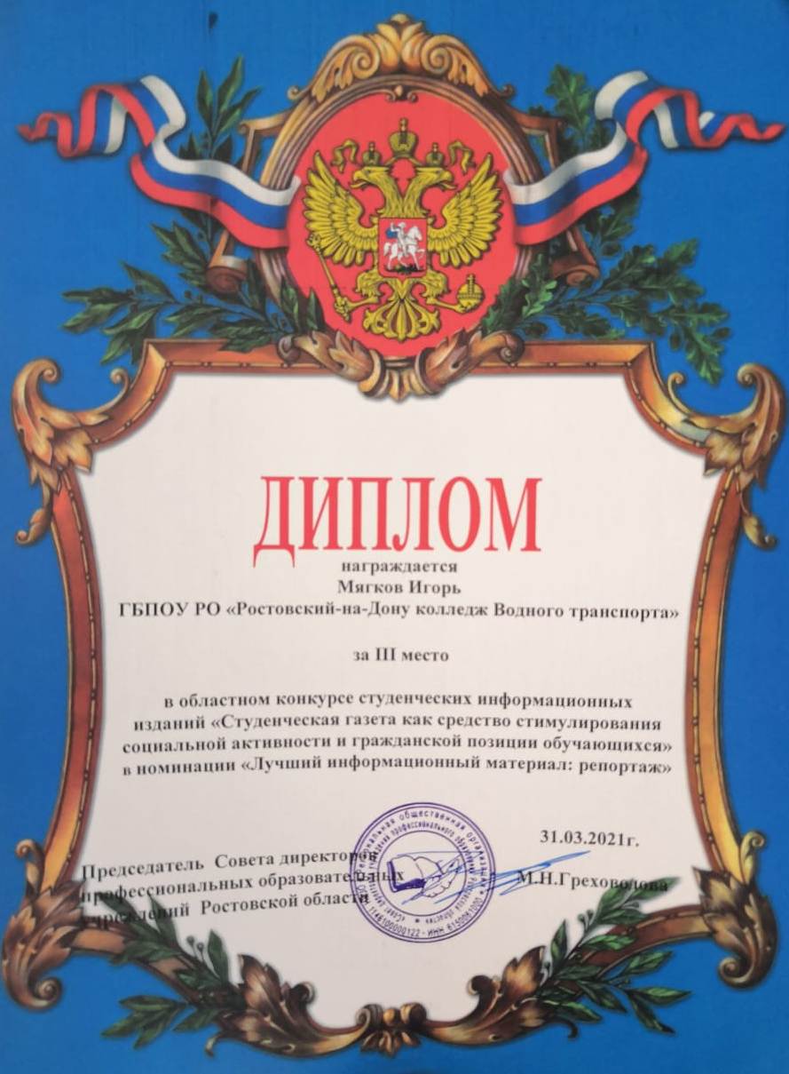 31 марта 2021г курсанты ГБПОУ РО «Ростовский-на-Дону колледж водного транспорта» приняли участие в областном конкурсе студенческих информационных изданий «Студенческая газета как средство стимулирования социальной активности и гражданской позиции обучающихся» в номинации «Лучший информационный материал: репортаж».