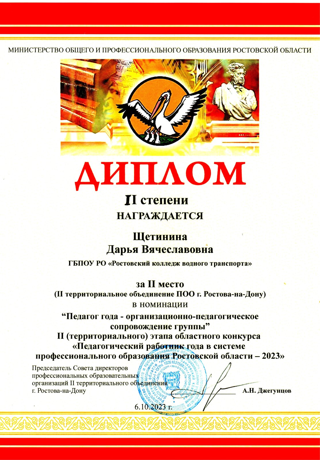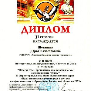 6 октября 2023 классный руководитель учебной группы курсантов, Дарья Вячеславовна Щетинина во 2 этапе областного конкурса «Педагогический работник года в системе профессионального образования Ростовской области – 2023 в номинации «Педагог года – организационно – педагогическое сопровождение группы по II территориальному объединению ПОО г. Ростова-на-Дону, заняла 2 призовое место.