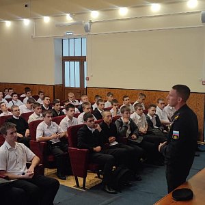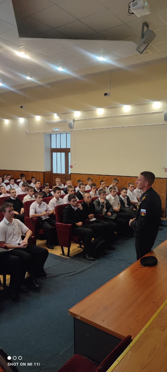 Перед курсантами первых курсов выступил его выпускник 2021 года, руководитель Совета старшин Ростовской региональной общественной военно-патриотической организации «Молодежный морской клуб», Ветеран боевых действий в специальной военной операции, младший сержант Завражный Александр Андреевич.