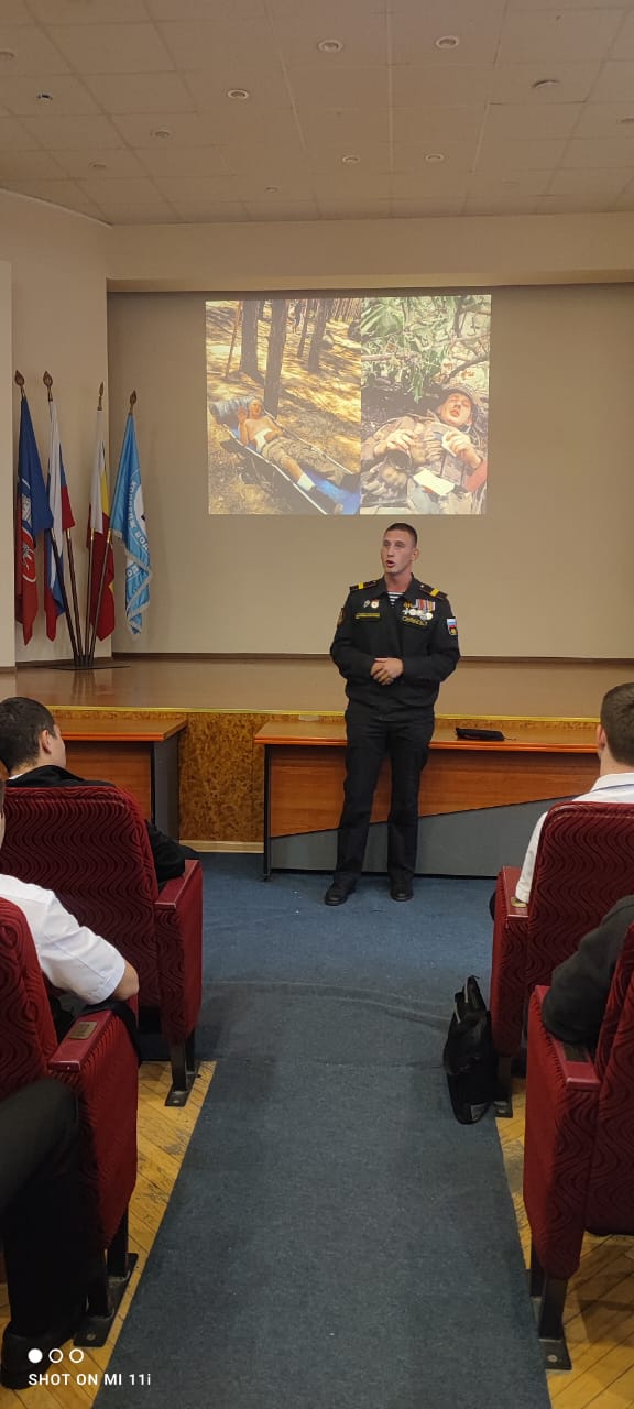 Содержательно и доходчиво им был доведен свой боевой путь в составе десантно-штурмового батальона морской пехоты Черноморского флота, в ходе военной операции на Украине. Отметил жаркие бои за город Мариуполь, за освобождение Курской земли.