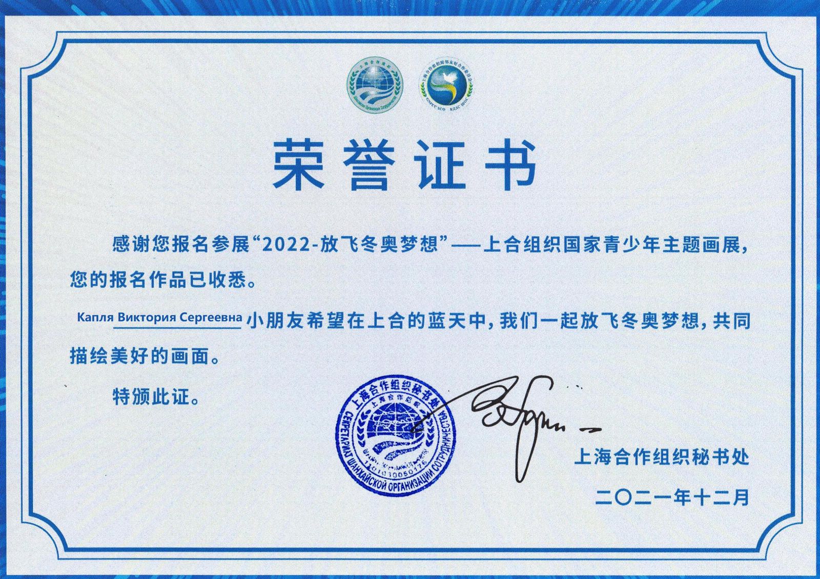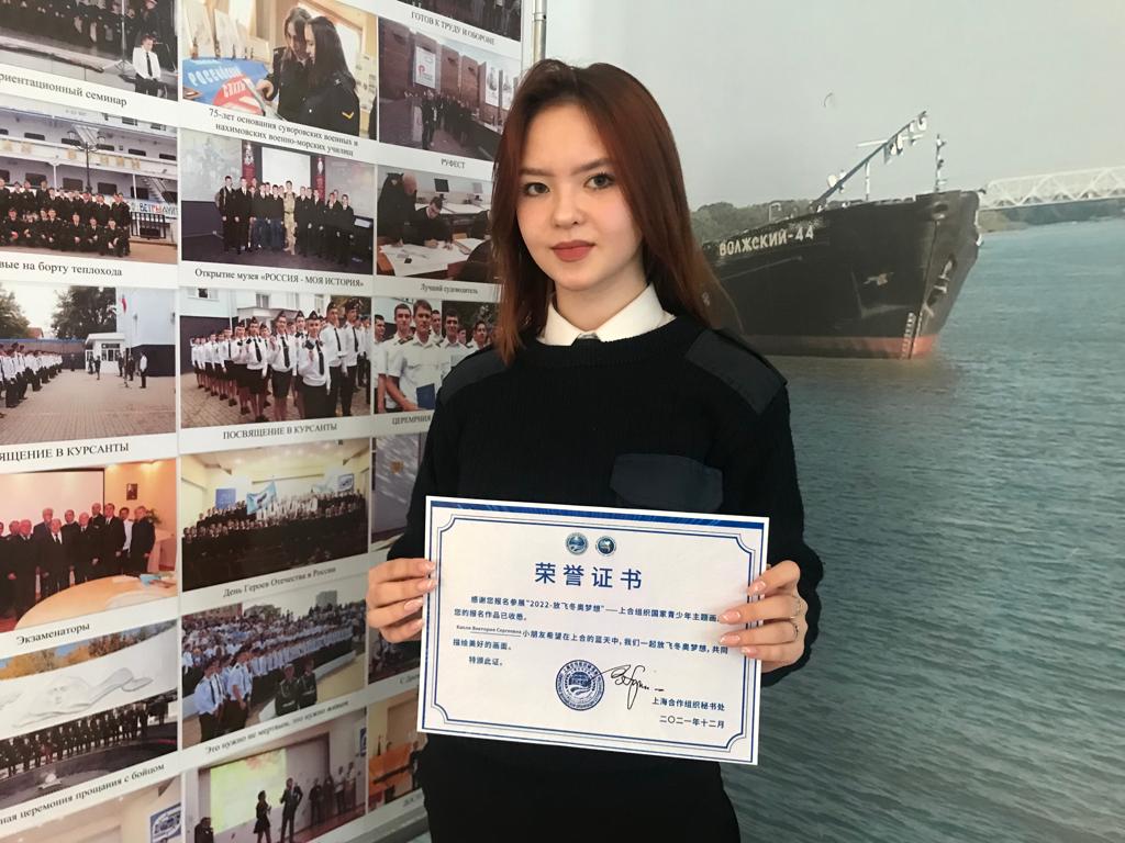 29 ноября 2021 г. курсант ГБПОУ РО «Ростовский-на-Дону колледж водного транспорта» группа Т-22 Капля Виктория, приняла участие в международной выставке картин детей и молодых художников стран ШОС «Высь за мечтой – зимние Олимпийские игры-2022 в Пекине». По итогам участия в конкурсе, Виктория была награждена почетным дипломом.