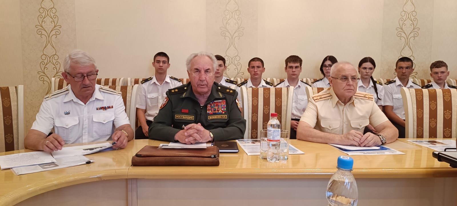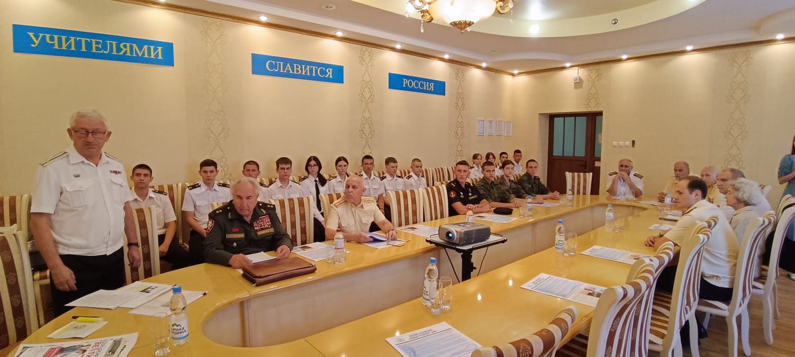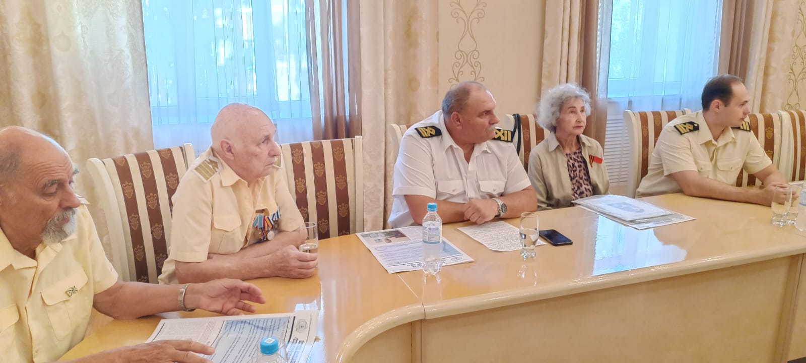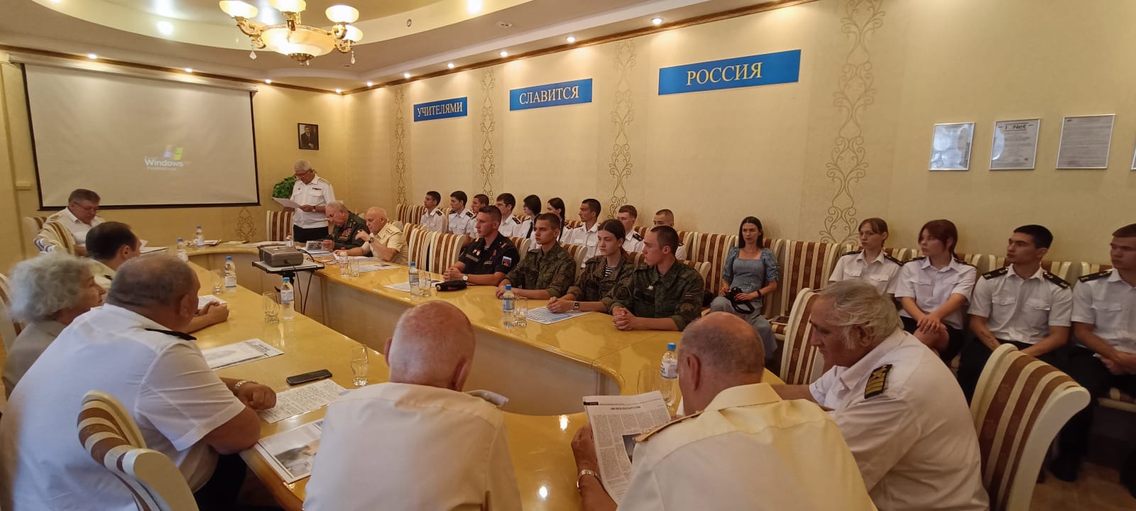 В заседании приняли участие Генерал-лейтенант Фоменко Г.П. -Председатель Комитета Законодательного собрания по делам военнослужащих. Рыбалко А.И. Председатель Морского собрания Ростова-на-Дону. Штофер И.Б. Зам. председателя Морского собрания Ростова-на-Дону. Дьяконов В.А. Юрист - консультант Морского собрания Ростова-на-Дону. Карасев И.В. член Совета старшин Морского собрания Ростова-на-Дону. Администрация, преподаватели и курсанты Ростовского-на-Дону колледжа водного транспорта.
