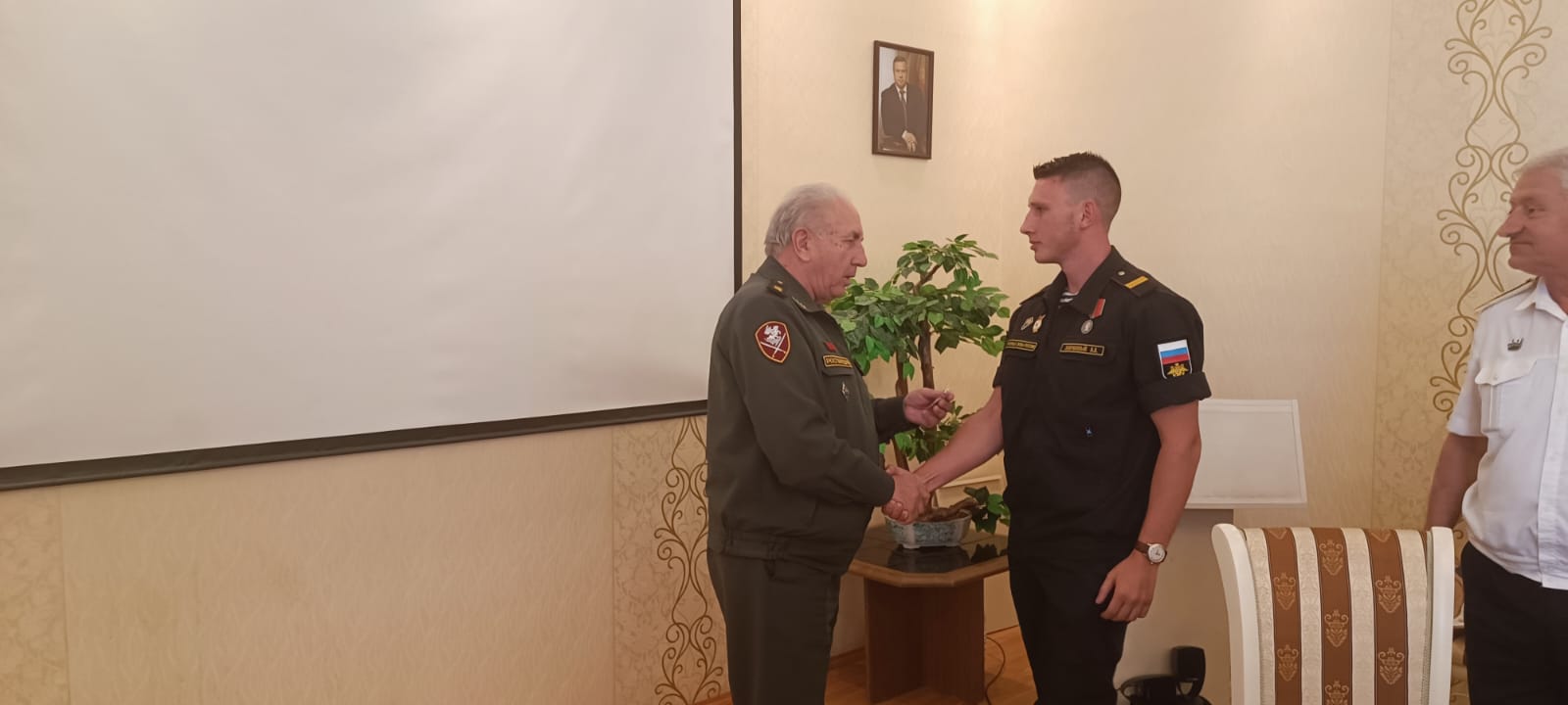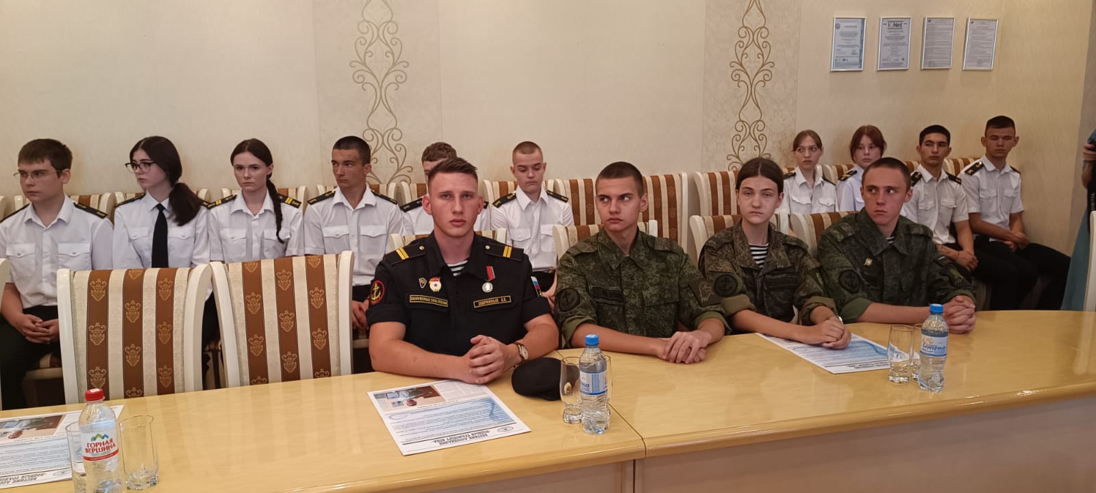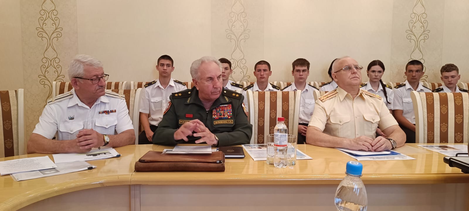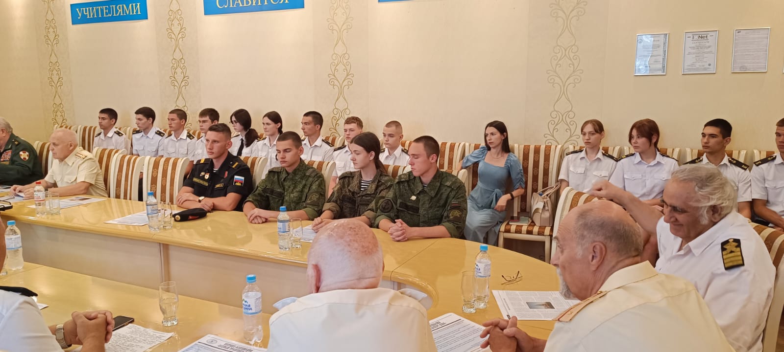 В заседании приняли участие Генерал-лейтенант Фоменко Г.П. -Председатель Комитета Законодательного собрания по делам военнослужащих. Рыбалко А.И. Председатель Морского собрания Ростова-на-Дону. Штофер И.Б. Зам. председателя Морского собрания Ростова-на-Дону. Дьяконов В.А. Юрист - консультант Морского собрания Ростова-на-Дону. Карасев И.В. член Совета старшин Морского собрания Ростова-на-Дону. Администрация, преподаватели и курсанты Ростовского-на-Дону колледжа водного транспорта.